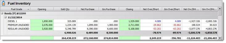 This shows your tank over/shorts for the day per fuel grade based on the sales of fuel leaving the store and purchases of fuel delivered to the store.