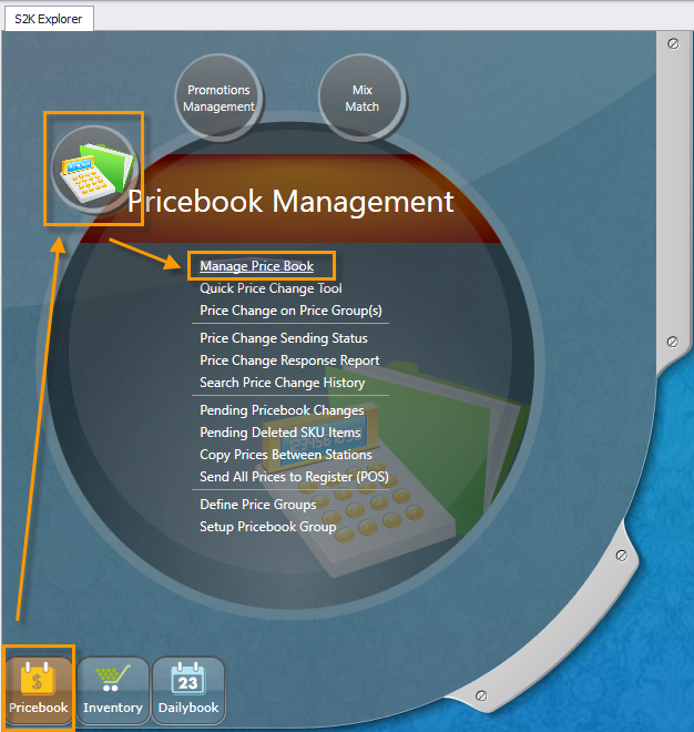 Once in the Manage Pricebook section you will see a Main Navigation portion at the top of the screen