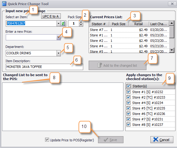 This will bring up the Quick Price Change Tool shown below where you can search for items, change their prices, departments and send them to the POS in one place.