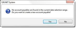 A window will pop up (pictured below) informing you that there aren’t any account payables found for the day. The window will give you the option to create a new account payable. Click YES.