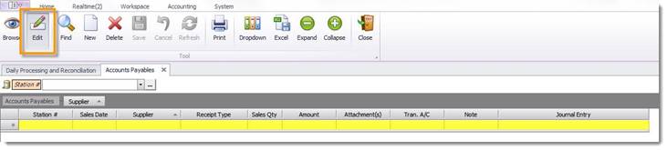 The Accounts Payable window will open. If the page isn’t already defaulted to EDIT, click the edit icon in the tool bar (shown in the picture below). Then you will want to enter information into the area highlighted below.