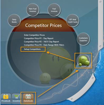 From the daily books section, click on the Competitor Prices bubble, open the Setup Competitors link: