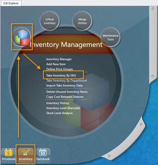 Once Inventory data has been downloaded into S2K, click on Inventory, then Take Inventory by SKU