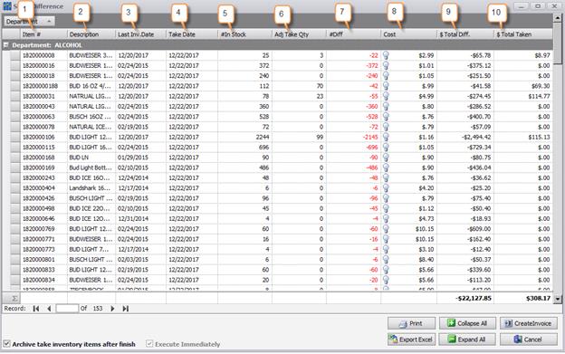 7. #Diff- The difference between the # In Stock and Take Qty