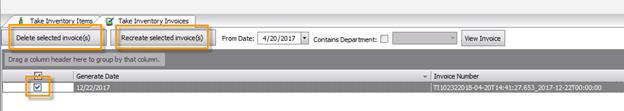 To delete or re-process an existing Take Inventory Invoice, click the box next to the desired inventory date and click either ‘Delete selected invoice(s)’ OR ‘Recreate selected Invoice(s)’.