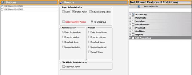 Select None– If all Groups are left blank, then username can be customized to include only the S2K features the user needs to access. This is done by clicking restricted and selecting only the allowed features from the Allowed Features menu.